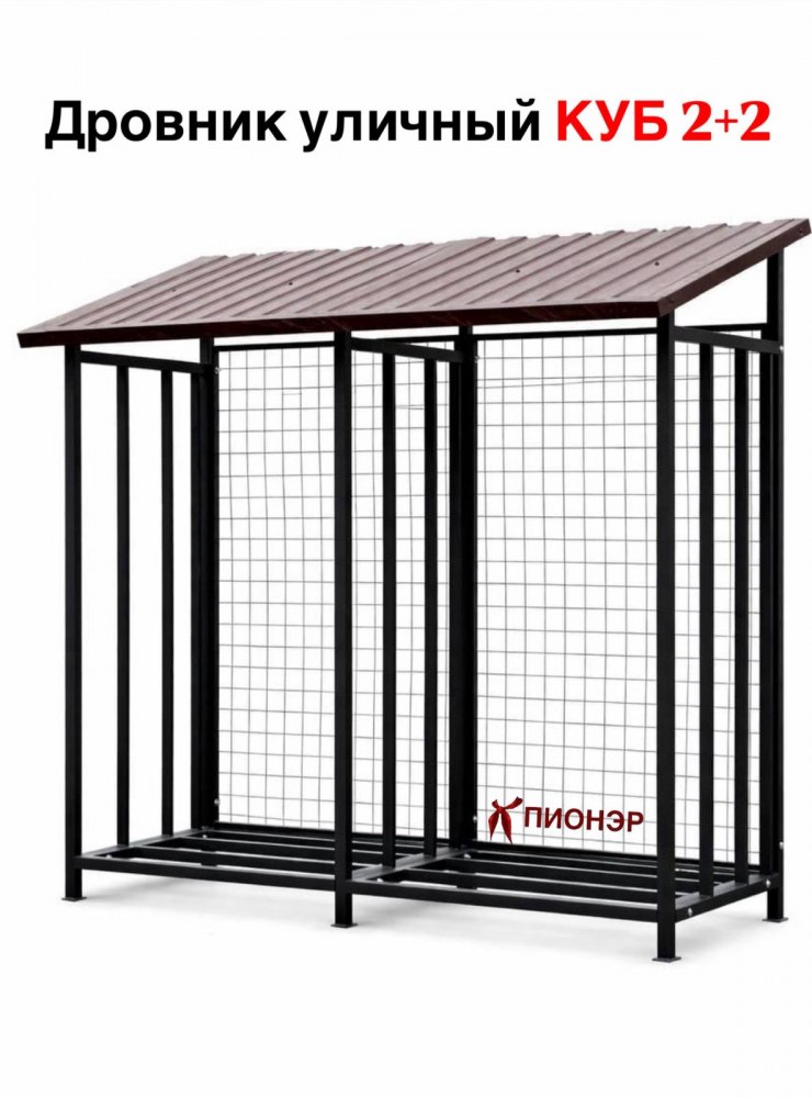 Металлический дровник КУБ 2+2 с сеткой (Пионэр) рассчитан для укладки в два ряда до 3,6 метров кубических дров, длиной поленьев 30 - 45 см.